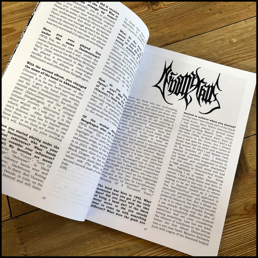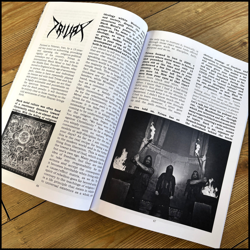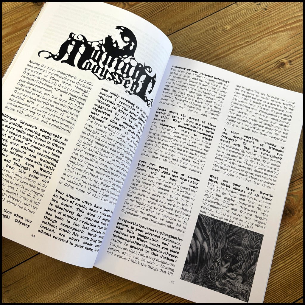 On this issue, editorial articles and interviews with: Spite Extreme Wing, Aborym, Minenwerfer, Antrisch, Marthe, The Gloomy Radiance Of The Moon, I, Voidhanger Records, Woods Of Desolation, Trivax, Deinonychus (early days interview), Midnight Odyssey, Swartadauþuz and… Plenty more to be soon announced!