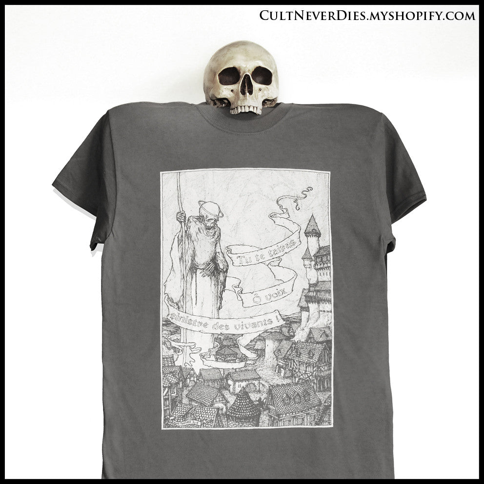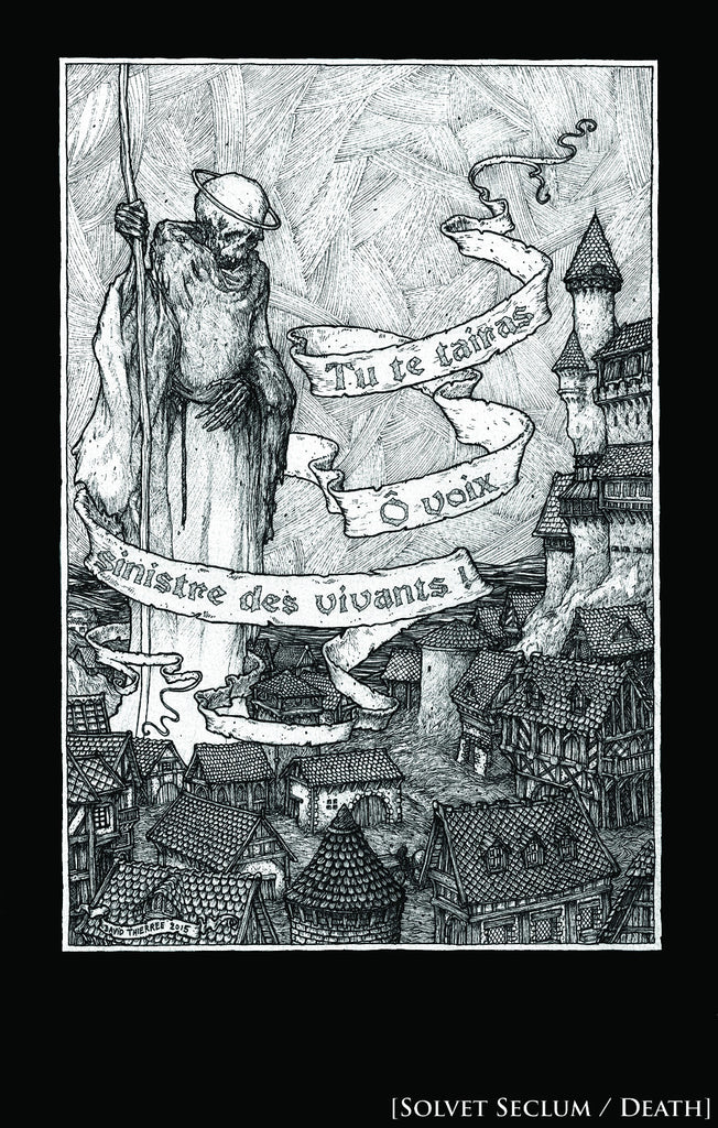 • Shirt 1: Solvet Seclum / Death (An ink drawing inspired by a poem by Leconte de Lisle, from 1889, taken from a compendium called Poèmes Barbares, depicting the end of the world.)