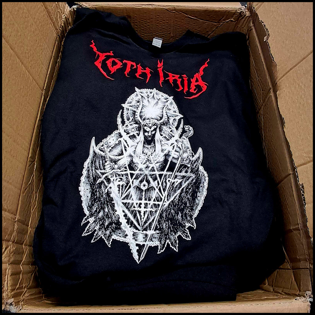 100% Official and Exclusive shirt celebrating the magick of Greek black metal powerhouse Yoth Iria, featuring Jim Mutilator of Rotting Christ and Varathron.