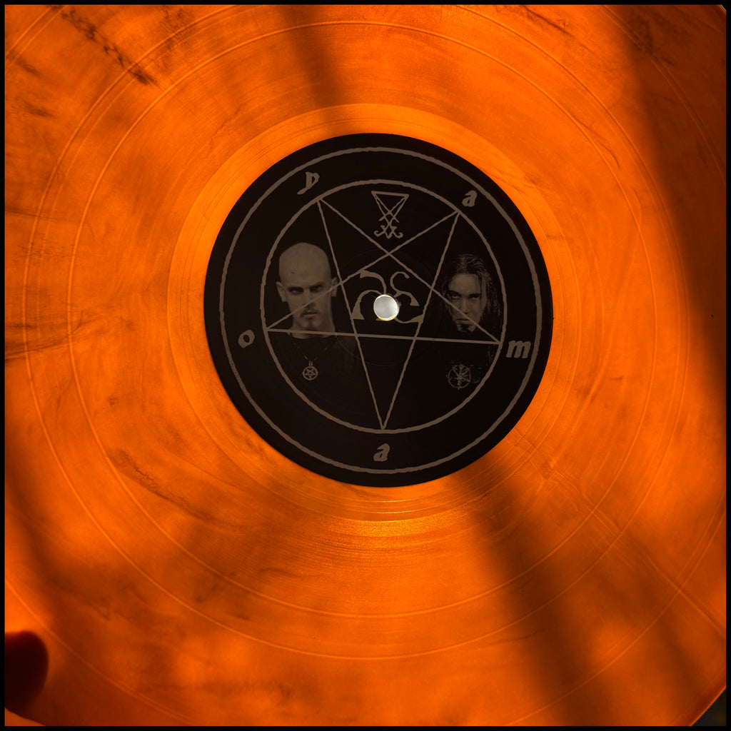 Orange crush with black marble effect 12" (140g), printed innersleeve, full-color on 220g, jacket full-color on 350g with 3D UV Spot, all assembled in a PVC overbag.